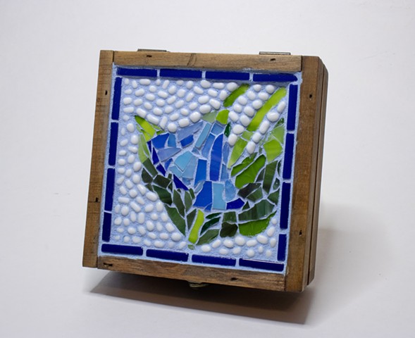 Repurposed wooden box stained with black walnut ink, glass tiles, cut glass, ceramic pebbles, and grout